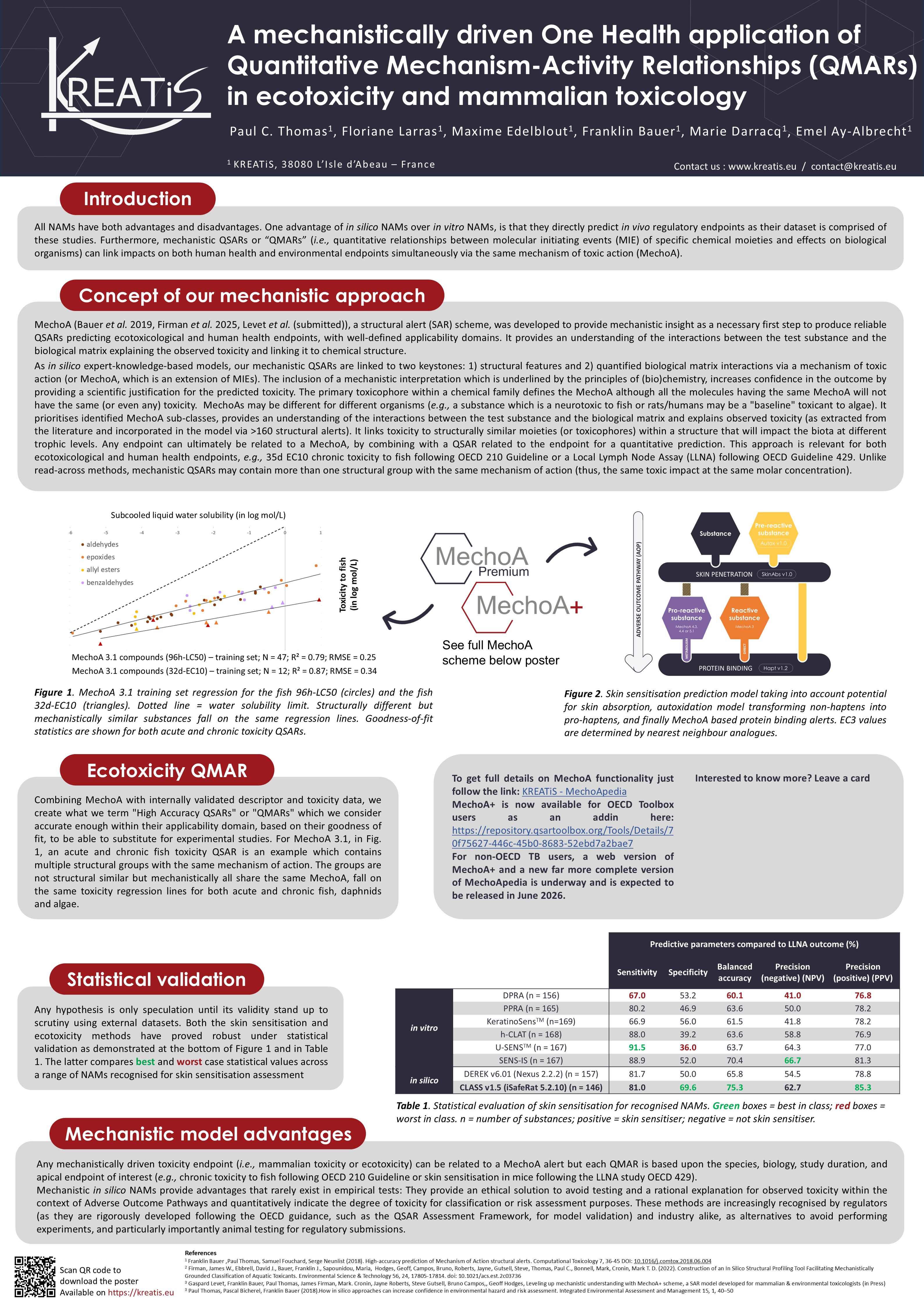 experiments, micro and mesocosms are associated with several drawbacks, for instance the identification of correct dose levels which would result in effects needed to determine the interactions which would be found in natural ecosystems and the reliable extrapolation of laboratory based ecosystems to the field experiments1. Insilico alternatives including Quantitative Structure Activity Relationships (QSARs) have been proposed in the recent years in response to the EU initiatives to minimize animal testing by replacing them with suitable and reliable approaches. QSARs are based on the principle that similar chemical structures can lead to similar biological activities and are commonly applied in the ecotoxicological risk assessment to evaluate the fate of chemicals in the environment. Recently, KREATiS developed a series of QSAR models called ‘HA-QSARs’ included in it’s iSafeRat Toolbox2 which in comparison to standard QSARs offers predicted values reliable enough to replace experimental studies and validated following the criteria specified in regulatory guidelines. The aim of this poster is to provide an introduction to the methodology for development and validation of HA-QSARs and briefly present ways in which such models of high precision can be fruitfully used to provide input data to help overcome the some of the above limitations in experimentation and achieve the best possible quality studies.